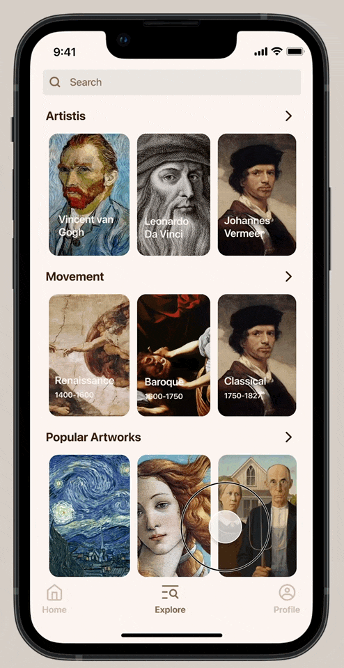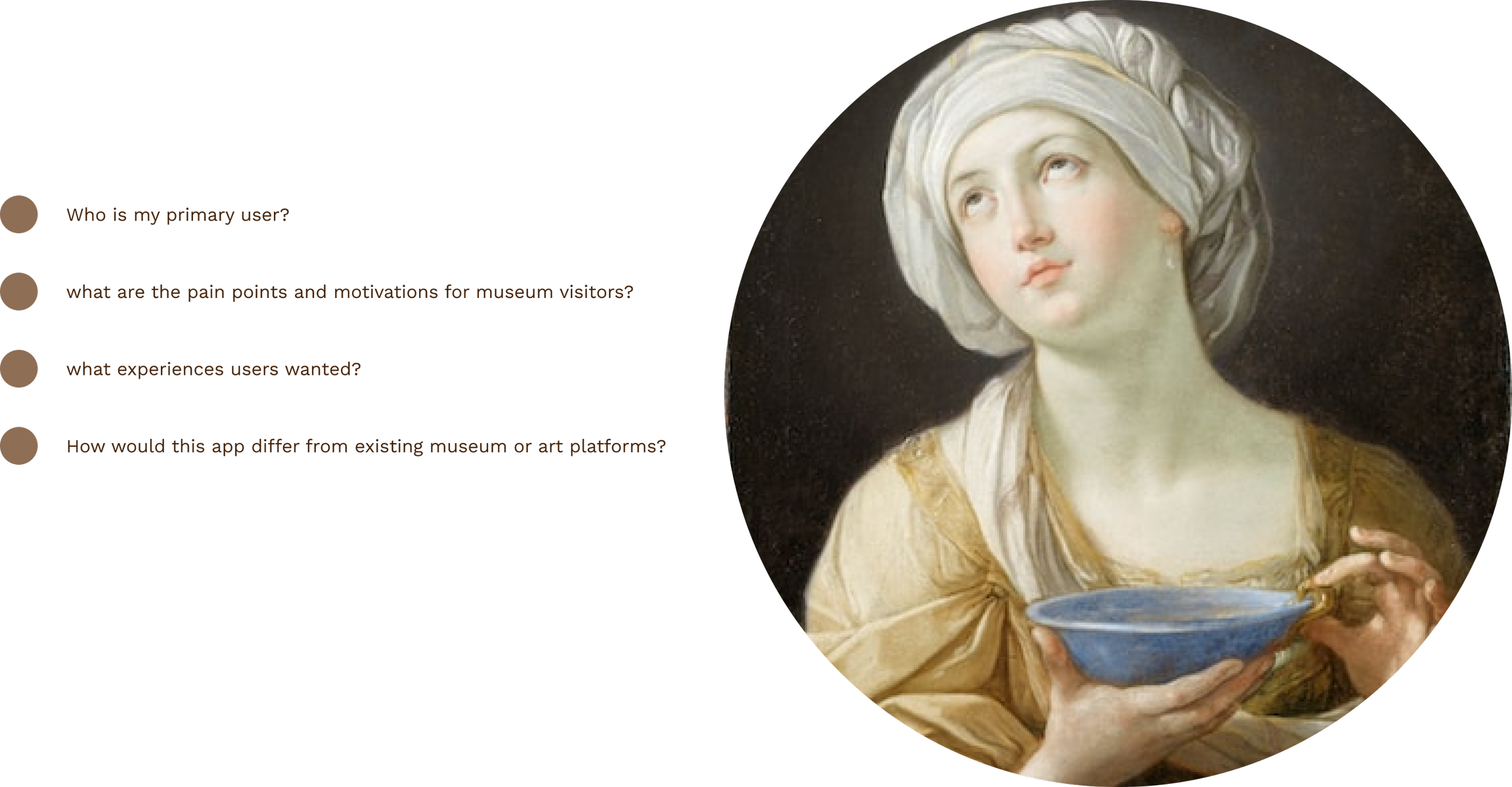 This was my first UX project, and since I am a museum and art lover, my enthusiasm made the whole process exciting. My professor guided me to come up with a lot of different ideas and thoughts, making instead of going into the design right after the research, it took more time to interpret the data collected and translate it into research results. Listing motivations, pains, and expectations gave me more confidence to define the real problem and devise a solution accordingly. I always start by thinking about the physical experience first before going into a digital one. By thinking about what we are used to, and applying it to digital will give an illusion of realism.